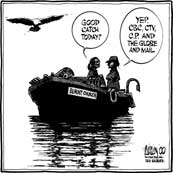 09-14 -00 Canadian Alliance leader Stockwell Day, the cartoon character of the year, turns up for a press conference on a Seadoo.